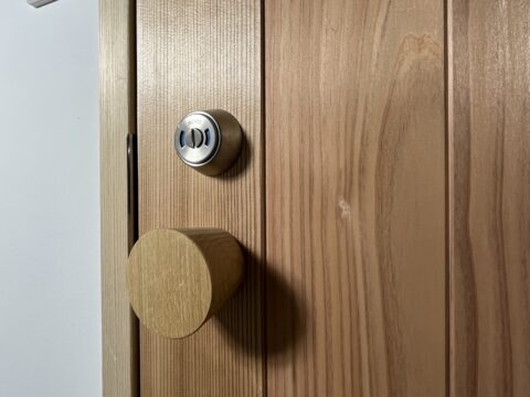 お客様のご希望で、ドアノブを丸い木製のものにしました。